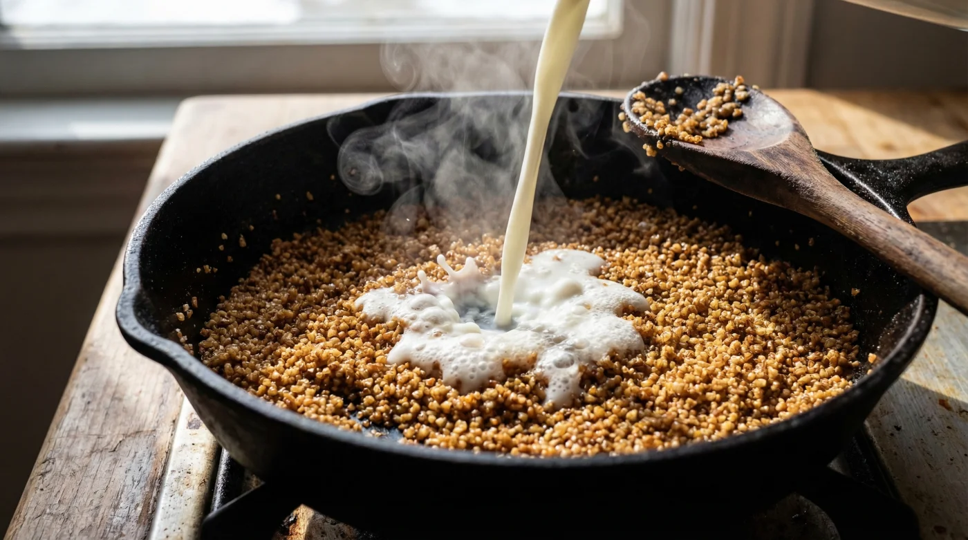 • Soğuk Süt Enjeksiyonu: Kavrulan irmiği ocaktan alın veya altını tamamen kapatın. İçinde şekeri erittiğiniz 4°C’lik soğuk sütü tek seferde tencereye boşaltın. İlk saniyede hafif bir buhar çıkışı olacaktır, hızlıca karıştırarak irmiğin sütü sakince çekmesine izin verin.