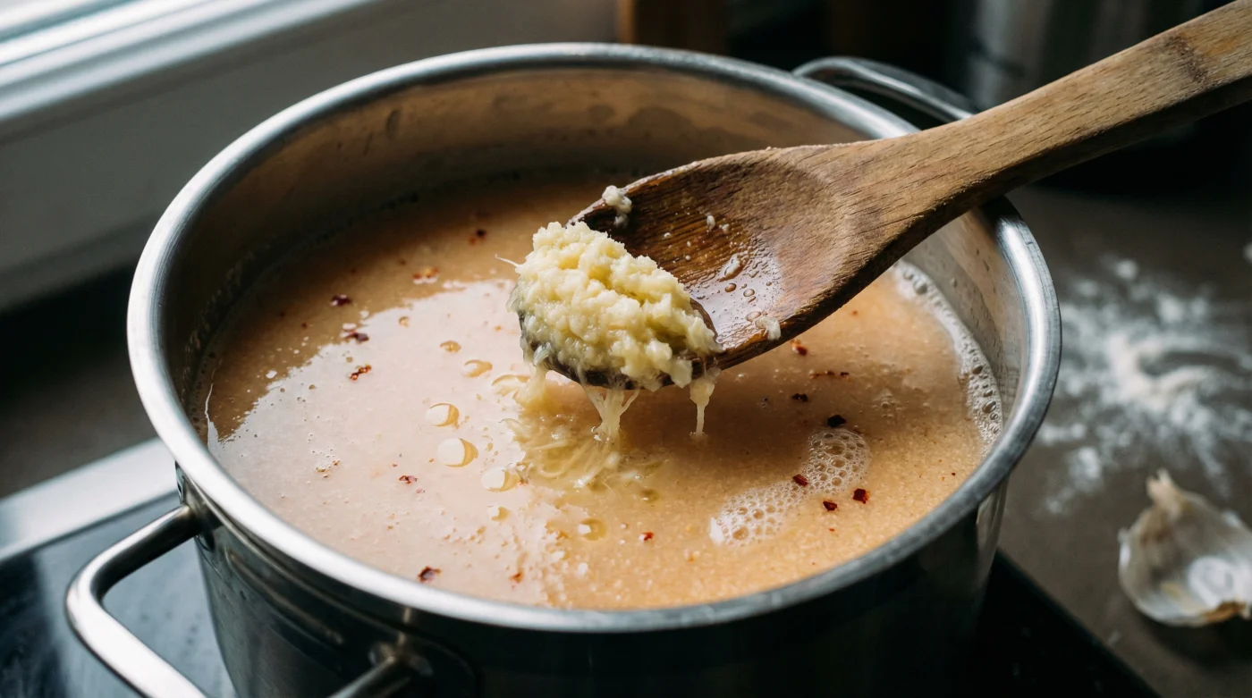 Tencereyi ocağa almadan önce bu karışımın tam beş dakika tezgahta dinlenmesine izin ver. Bu beş dakikalık bekleme süresi, suyun, sarımsağın ve tarhananın birbiriyle tanışıp harmanlandığı o kritik andır. Sürenin sonunda kalan suyunu ilave edip ocağın altını aç. Çorba kaynayana kadar yavaş, 8 çizer gibi ritmik hareketlerle karıştırmaya devam et.