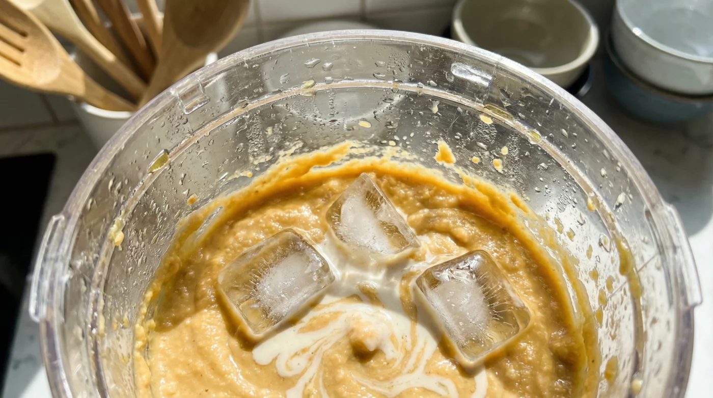 Sen kapağın üzerinden izlerken, buz eridikçe içindeki dondurucu su yavaşça harca karışacak. O ani soğuk şok, tahinin yağını kusmasını anında durduracak ve suyu yağ ile moleküler düzeyde birleşmeye zorlayacak. Tıpkı ustalık gerektiren bir mayonez yaparken yağ ve yumurtanın birbirine tutunması gibi, buzlu su da tahin ve nohudu tek bir vücut haline getirir. Sadece kırk saniye içinde harcın havalandığını, renginin açıldığını ve adeta yumuşak bir dondurma gibi kabararak kremsi bir forma ulaştığını kendi gözlerinle göreceksin.