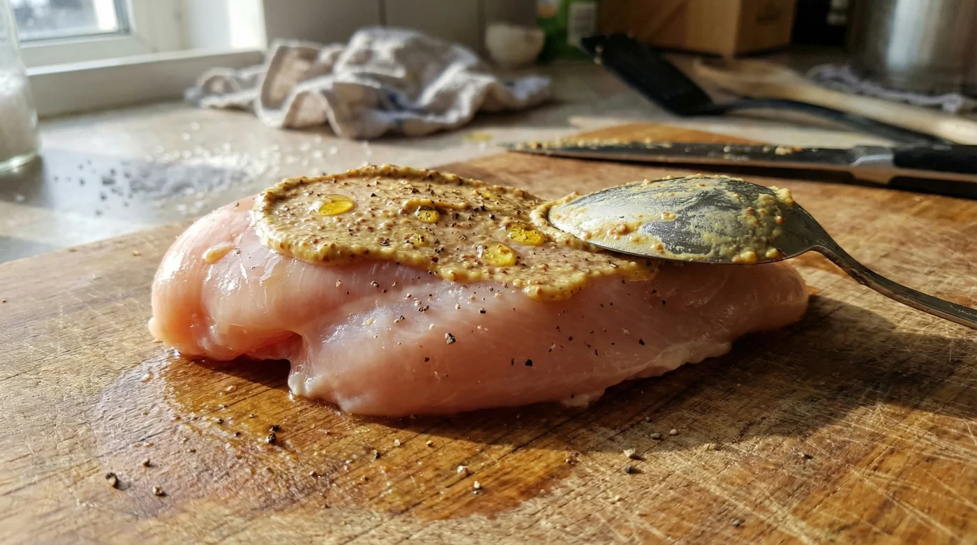 Eti fırına vermeden önce yapman gerekenler oldukça ritmik, neredeyse meditatif ve basittir. Öncelikle, marketten veya kasaptan aldığın tavuk göğsünü mutfak tezgahına al. Yüzeyindeki o fabrikasyon fazla ıslaklığı temiz bir kağıt havluyla, hafif dokunuşlarla kurula. Etin kuru olması, uygulayacağımız zırhın yüzeye sıkıca tutunabilmesi için ilk ve en önemli şarttır. Islak bir yüzeye sürülen hardal tutunamaz, suyla birleşip fırın tepsisine akar gider. Ardından, bir tatlı kaşığı kadar pürüzsüz Dijon veya sade sarı hardalı parmak uçlarınla etin her iki yüzeyine masaj yaparak yedir. Sadece ince, yarı saydam bir film tabakası yaratıyorsun. Bu dokunuş eti adeta bir ikinci deri ile kaplar.