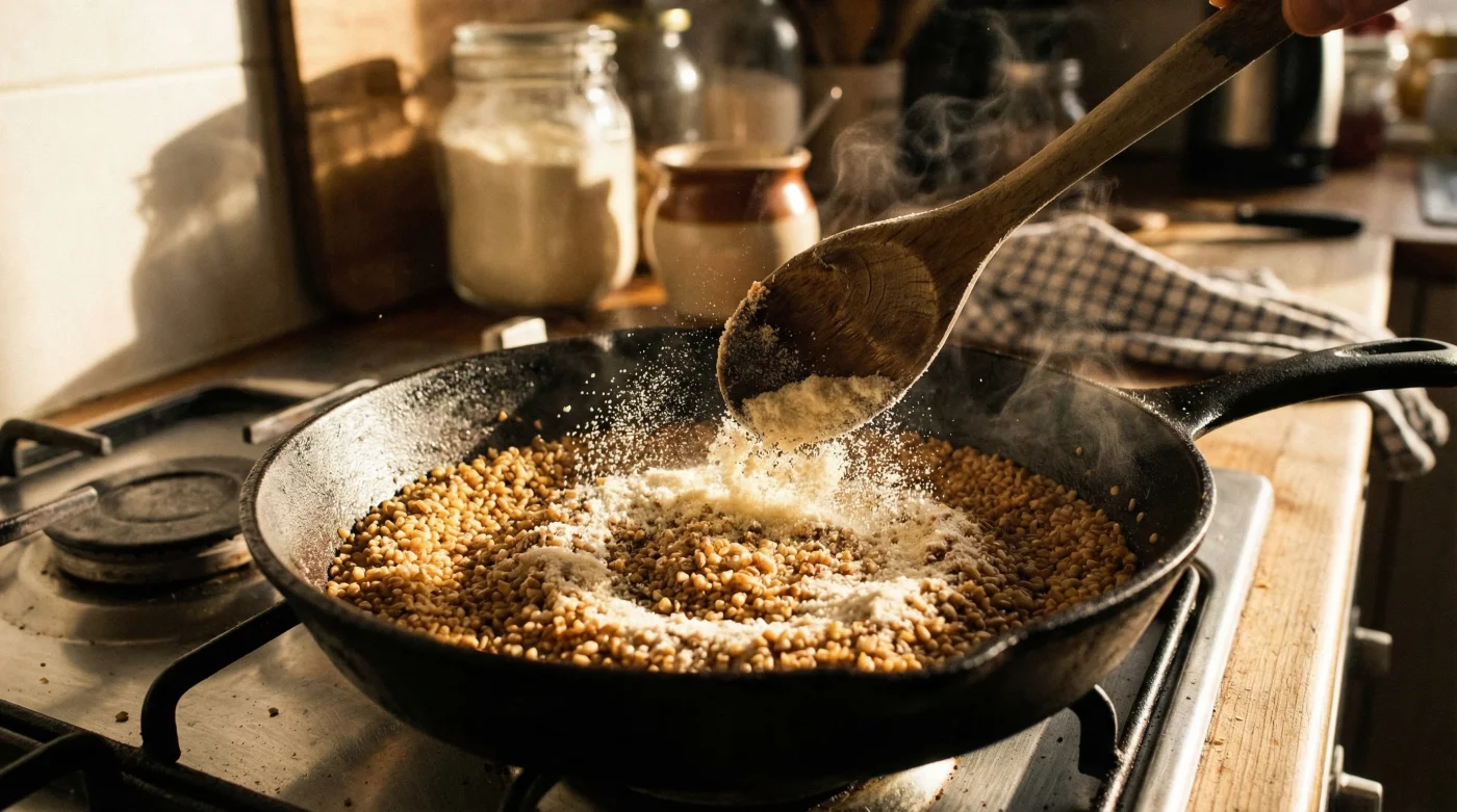 - Kavurma Aşaması: İrmiği klasik şekilde kavurmaya başlayın. Rengi hafif dönmeye başladığında süt tozunu ilave edin.