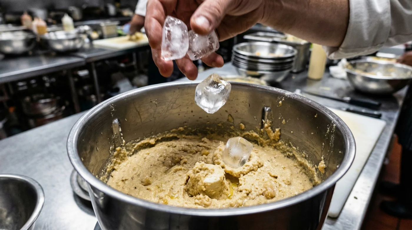 Mutfak robotunuz çalışırken içeriye atacağınız birkaç adet buz küpü, kimyasal bir sihir gibi etki eder. Buz, makinenin yüksek devirli bıçakları arasında parçalanırken karışıma yavaş yavaş ve buz gibi bir sıvı bırakır. Bu ani soğuma işlemi, tahin ve nohut nişastasındaki yağ moleküllerinin kusursuz bir şekilde emülsifiye olmasını (bağlanmasını) sağlar. Soğuk şok, karışımın içine hava hapsederek humusu ağır bir ezme olmaktan çıkarıp adeta ipeksi bir buluta dönüştürür.