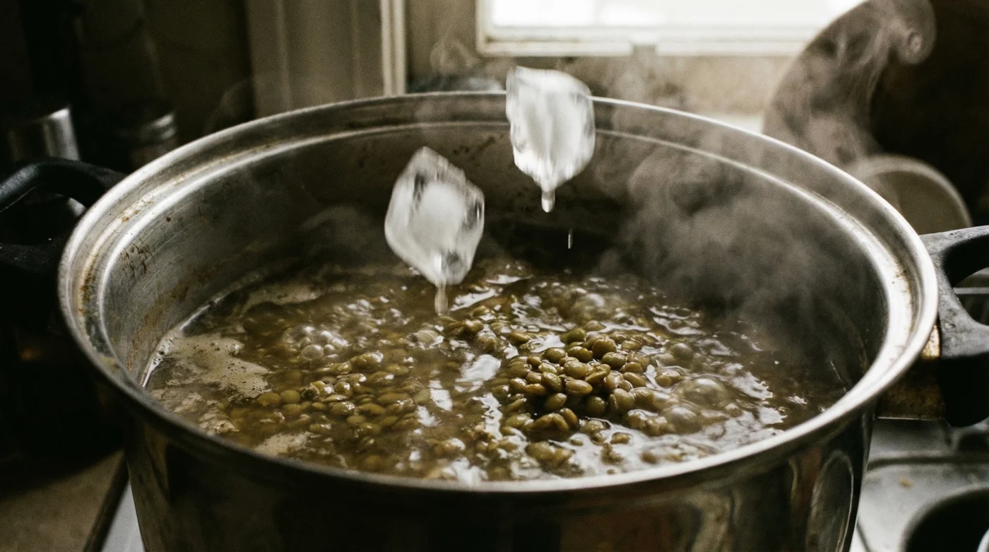 Yeşil mercimek haşlanırken suya atılan birkaç buz küpü, tencerede ani bir ısı değişimi (şoklama) yaratır. Bu termal şok, mercimeğin dış kabuğunu anında sıkılaştırır ve pişme süreci boyunca kabukların iç kısımdan ayrılmasını tamamen durdurur. Sonuç? Dağılmayan, diri ve pürüzsüz görünümlü mükemmel yeşil mercimekler.